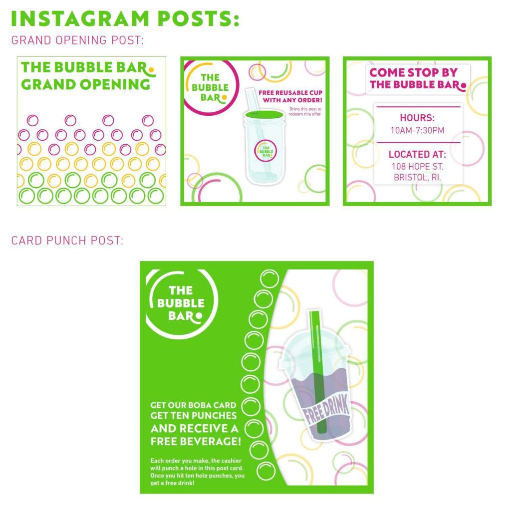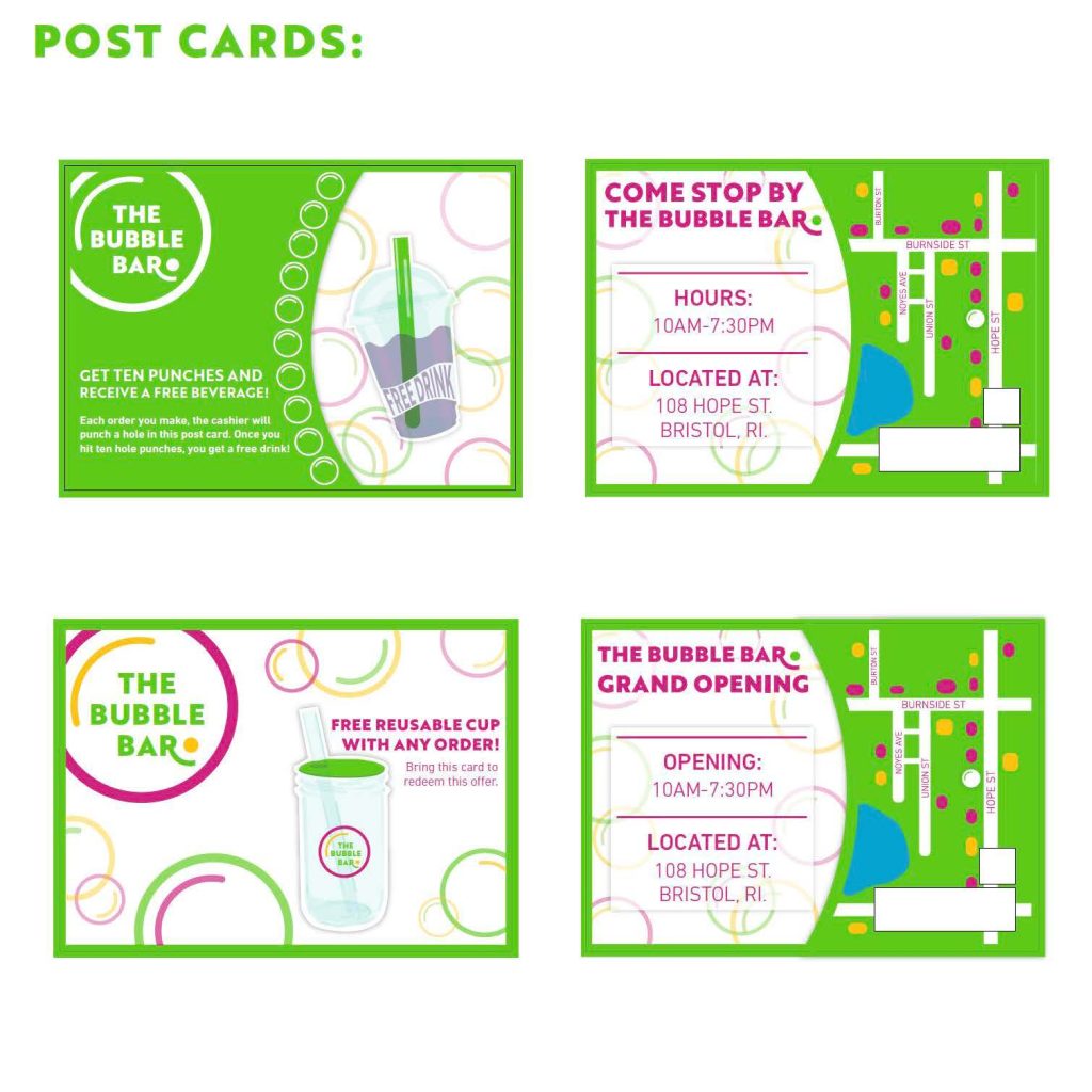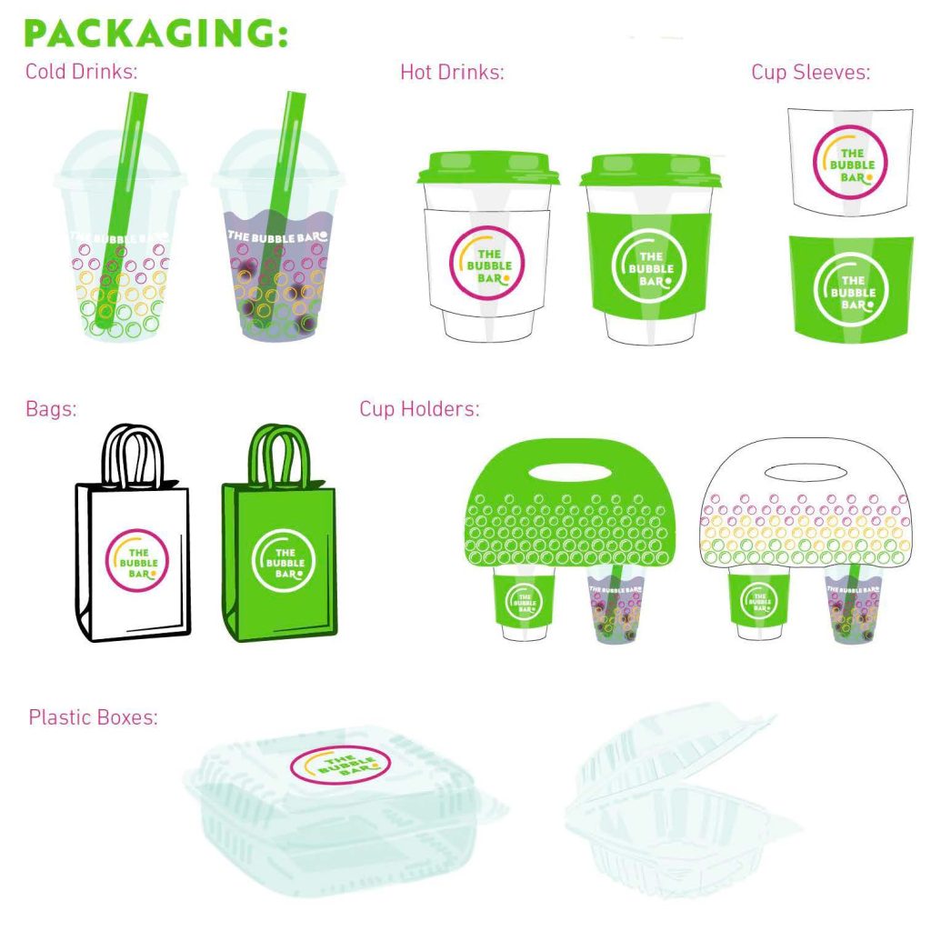 Hello all!! It’s been a while, and I’ve been up to a lot recently. Let me catch you up! It’s the Spring semester and I’m as busy as ever! I’m in the middle of a few different exciting projects right now. One is for my Brand Identity course, as we create a coffee/tea shop from the ground up. I’m creating a Boba shop, because who doesn’t love boba? I came up with The Bubble Bar since I found that a lot of people all boba, “bubble tea.” Check out the progress;